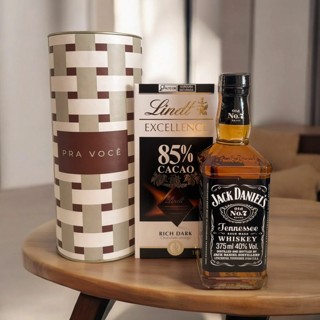 Surpreenda alguém especial com este presente sofisticado e elegante, montado em uma lata decorada que combina dois itens de excelência: uma garrafa de Jack Daniel's Original 375ml e uma barra de chocolate Lindt Excellence 85% Dark 100g.