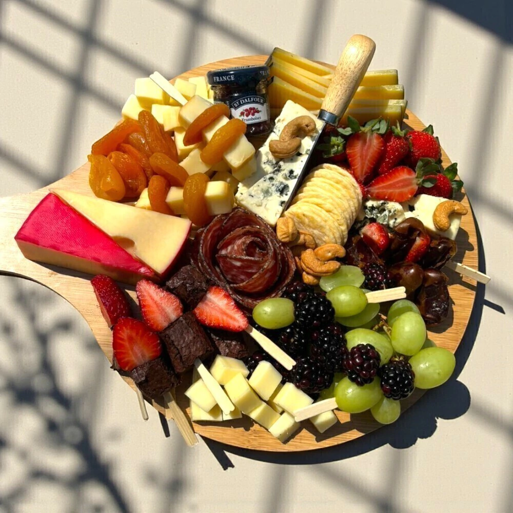 Um presente sofisticado e cheio de sabor! Nossa tábua gourmet é cuidadosamente montada com queijos selecionados, frutas frescas, frios e acompanhamentos especiais. Além disso, acompanha faca de corte em inox com cabo de madeira e uma bandeja de bambu reutilizável, que transforma a experiência em um momento ainda mais elegante.